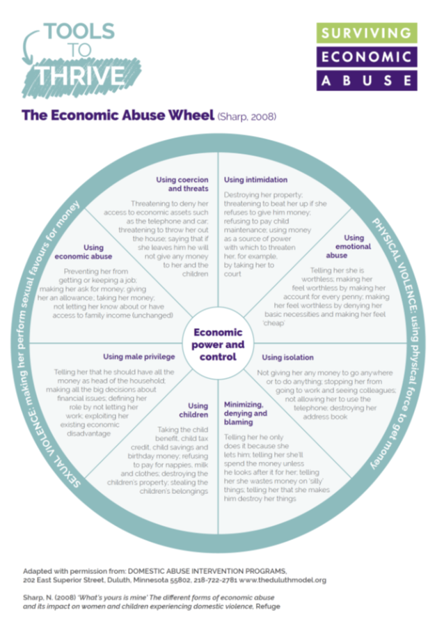 Financial abuse is a means of controlling someone through taking away control of finances and resources. Financial abuse is also known interchangeably as economic abuse and both are a form of coercive control. In the absence of resources, it can be extremely difficult to leave an abusive relationship and see a life beyond abuse. Financial abuse can be the control of liquid assets (e.g. your wages) or equity (e.g. your house). The manipulation of money and other economic resources is one of the most prominent forms of coercive control, depriving women of the material means needed for independence, resistance and escape.